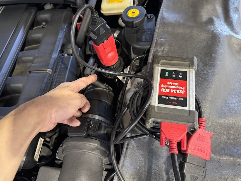 故障コードを消去するには、エンジンルーム内のエアクリーナーのダクトのあたりにあるOBDに専用ツールを接続して消去します。
